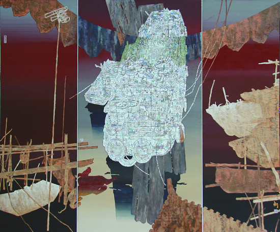洪泽湖碧波万顷、荷香鱼跃,素有“日出斗金”之称,修建于秦代的洪泽湖大堤,被誉为“水上长城”。画家栾剑选取了他最为熟悉的渔家生活和文化遗存作为绘画创作的原始素材,绝非是出于猎奇的偶然。在淮安书画院,有个像栾剑一样醉心于艺术追求的画家部落。作为一名基层美术工作者,服务于民众是他们美术创作的原始动因。出于对家乡的热爱和文化的自觉,同在淮安书画院供职的陈书生、赵家葆、杜愚、张晓倩、崔竞文等淮安籍画家,纷纷拿起画笔,用水墨和油彩抒写着他们生命里的感动。淮安市文广新局深谙“艺术贵在创新,一手生活、一手传统、一手创新,画家要从生活中汲取创作源泉(冯大中语),”为书画院的每位书画家提供了良好的创作条件,鼓励他们走出去写生、创作、研修,关注民生,讴歌家乡的美丽与祥和。受淮安这种人文和艺术氛围的感召,来自外省市的左希文、汪秀南、田助仁、范海龙等先后考进淮安书画院,成为专职画家。栾剑读大学时学过油画,基本功很扎实,曾经是一名优秀的美术教师,后因工作需要调到淮安市书画院任院长。正是在这种文化理念和背景下,栾剑来到了北京,先后求学于中国人民大学林凡工作室、首都师范大学郭继英重彩工作室、文化部重彩高研班。在跟随中国工笔重彩大家郭继英求学期间,栾剑的思想和画技得到了迅速的提升,长期的生活积淀与感悟在重彩工笔山水这块温润的土壤里发芽。在导师的指引下,他找到了最适合自己的表现淮安地域文化的形式和语言,淮安千年的水性,被他提升成重彩表现的绘画符号:充满渔家生活气息的船屋、述说着淮安千年沧桑的河下古镇民居,记录着淮安文脉传承的清江浦楼……大湖扬帆,人水共谐。在栾剑此时的眼中,山水已不再是一个名称,而是“一个美学理念、人文概念,是静观自然和社会之后去组合的理想家园,这个家园是水土,是养育他的水土(谢振瓯语)。”郭继英对学生们说过:空间构成了我们的存在,存在决定着意识,意识外化为文,文如其人,作为画家,其文终显于画面,比起抽象的文字,具象的画面更能直观地浓缩共性存在的理由,展现个性的审美诉求。罗中立正是通过《父亲》这个已经成为中国农耕文明时期所有农民父亲的时代性标识,完成了父亲主题的创作主体个性向人文共性的华丽转身,成为中国美术史上油画创作的重要篇章。栾剑的水上家园系列作品,“勇于将江南淮安的城市面貌巧妙的归结,并用综合的艺术思考进行了提炼,将西方、日本有益的元素融入中国画的多点构图、散点透视中,给人以新的视觉享受(李魁正语)”。栾剑和他淮安的同仁们会继续用中国画的独特语言,向我们解读着淮安人行走在水上的千年神话,诠释着他们对家乡水文化割舍不断的脐脉情结:你若安好,便是晴天。