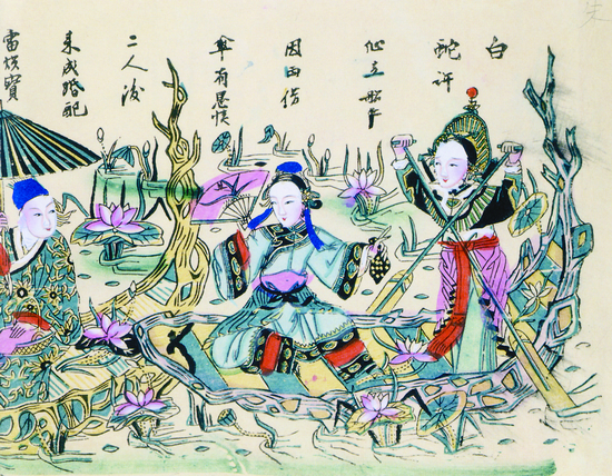 在“白蛇传说”中,小青形象经历了由最初的各种精灵鬼怪到明末冯梦龙拟话本的青鱼精再到最终定型为青蛇精的变化。图为根据白蛇故事创作的朱仙镇年画(局部)