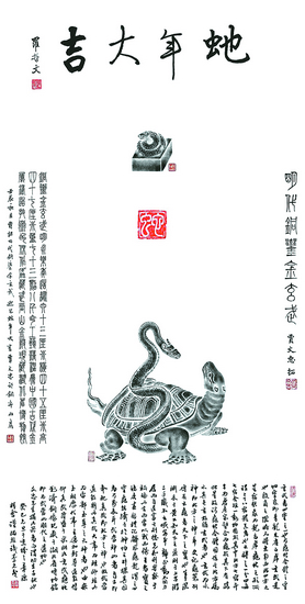 在农历蛇年来临之际,青铜器鉴定专家贾文忠推出生肖青铜器全形拓新作《蛇年大吉》。
