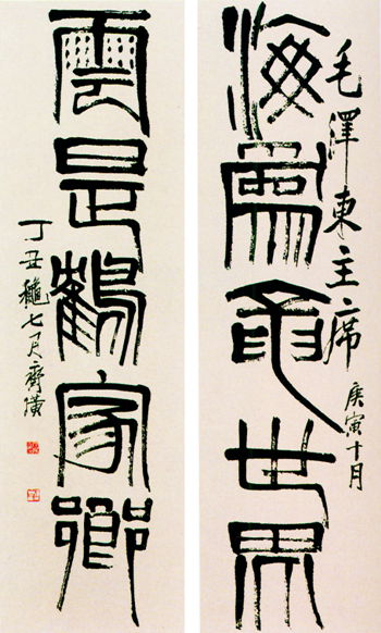 1949年北平和平解放,齐白石转交了一封姓周的湘潭老乡写给毛泽东的信,毛泽东写信向齐白石致意,齐白石刻印两方送毛泽东。1950年春,江青造访齐白石住所,带去毛泽东问候并约齐白石共叙乡情,通知会晤时间、地点以及接送方式。3天后,毛泽东在中南海丰泽园设宴招待,朱德老总以及俞平伯作陪。当时丰泽园中两株海棠三丈多高,且值花期正盛,毛泽东与齐白石共同赏花叙乡情,毛泽东还问及齐白石的艺术创作以及健康状况,然后大家一起共进晚餐。这使齐白石深受感动,尤其是宴席上地道的家乡菜让齐白石回味不尽。因为来京几十年了,齐白石家里请的厨师是北方的,餐馆里的湘菜炒来炒去早就变味了,吃到纯粹的家乡菜,真正找到了回家的感觉。回家后齐白石精选自己珍藏多年的端砚、歙砚各一方送毛泽东,后来又将自己多年珍藏的得意之作赠送毛泽东,一幅为自己1937年书写的篆书楹联“海为龙世界,云是鹤家乡”;另一幅是1941年画的《松鹰图》,齐白石另加题款,毛泽东都报以丰厚润金。其中的楹联极富深意,因为齐白石用传统观念,把国家领袖毛泽东比喻为龙,赞美毛泽东的功业改变了中国的旧江山;又把自己比喻为闲云野鹤,表明自己志在乡野。