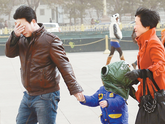 近日北京遭遇沙尘袭击,游客在北京天安门广场游览时迎风前行。 新华社记者 金良快 摄