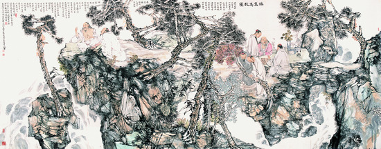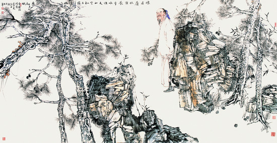 淼田先生的“林泉高士”系列,大致有两种类型:一种是以大景山水为主、古意人物为辅,多为全景,表现“天地大美”的境界,应合“天人合一”的精神;另一种是以人物为主、山石花树为辅,多以近景,立足于由诗性的内容美转化为诗性的形式美的探求。前者多为缜密精致、积健为雄的大作,后者多为率意而为、笔随心转的小品。前者真情内蕴,大美不言,后者抱骨藏精,形简神完。偏爱“林泉高士”系列中以大景山水衬托古意人物的大作,那种全景山水的雄奇苍辣、钟灵毓秀,都不乏开阔的空间、层叠的峰峦、岩壑的起伏、古松的奇伟、云行的迅疾、瀑水的曲折,无不透露出朴茂高华的气格。远观的古意人物处于这天高地阔、万千气象的山水之间,人与景汇,情与景融,山水因人物而清音,草木因人物而生情韵,无不蕴涵着“天地悠悠”的慨叹。画家凭借精于人物、工于山水之长,以一种在广大空间的千丘万壑中驰骋神思表达超越视界的审美感情,开发了山水画精神表现的新领域,卓然而立于如今名家辈出的中国画坛。