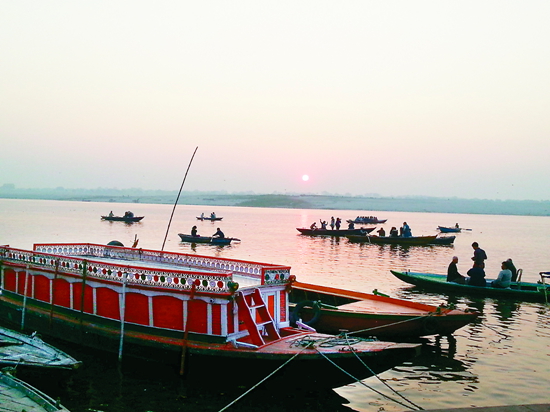 恒河 在一般人的观念里,通常“圣河”=“清流”,不过即使现实中它是条“浊流”,也依旧不会伤及恒河的神圣性。恒河中游的瓦拉纳西被称作“圣城”,它以宗教中心的身份繁荣至今,且从未衰退过,此地能保有3000多年的历史,可说是世界上罕有的城市。天未亮,即渡上小船划向河中央,从水面上看恒河更加宽广,对岸的地平线开始闪闪发亮,太阳即将升起。