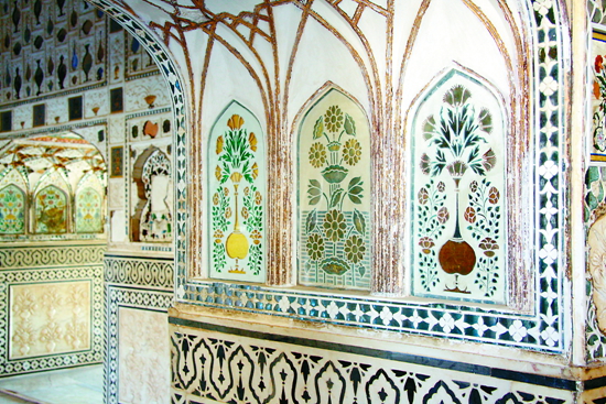 “琥珀堡” 斋蒲尔最令人叹为观止的“琥珀堡”,要骑着大象到达古堡,以白色大理石建造、极尽雕刻装饰之能事。斋蒲尔还是传统工艺重镇,尤其是大理石雕刻工艺。这里的细密画也非常有名,通常是在一张扑克牌大小的纸上作画,也都是家族世代相传,一张画要画上两天。