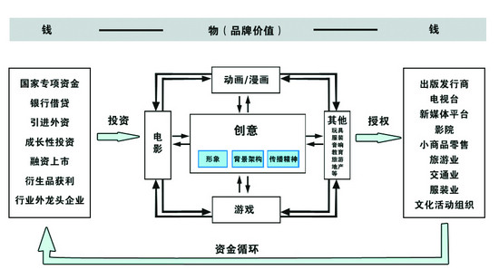 如图1,动漫产业链的循环无非就是从钱到物再到钱的过程。我国动漫产业尚处于起步阶段,对于大多数中小型动漫企业来说,实现资金循环并不是一件容易的事。因此,从源头到衍生产品都不能局限于动漫产业本身,要打开眼界,寻求多方发展。而在这些市场行为背后,动漫品牌价值是最值得投入,也是最为重要的环节。