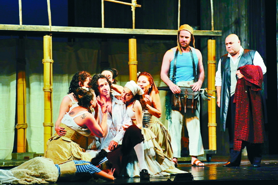舞台呈现上,我们又见到了熟悉的以色列式天马行空的想象。可贵的是,导演在构思上充满想象力,始终服务于剧情的发展和人物的塑造。那替换了原著中马车的自行车;飞舞在自行车前后、挂在竹竿上的海鸟;既能作为码头又能作为房屋、在舞台上高速转动的二层竹架;乡妇们手中的白色长绸竟能化身波涛汹涌的大海,把唐璜和他的仆人淹没其中。特别是当众乡民跳入“水”中营救唐璜主仆时,白绸荡起,舞台光影瞬间变成海底世界,演员们的动作也突然缓慢下来,犹如潜游于水下,全场观众为这样精彩的演绎而热烈鼓掌。