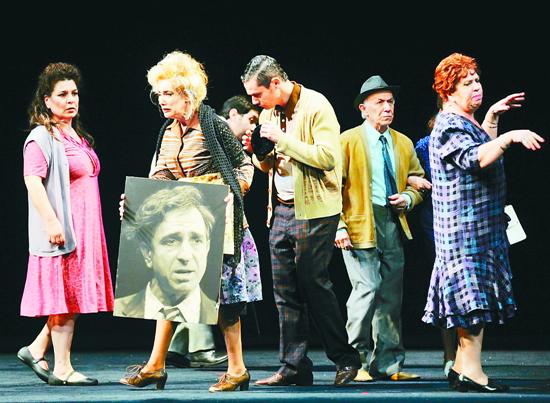 首先与京城观众见面的是《手提箱包装工》(又译《旅人》),首演于1983年,被认为是哈诺奇·列文早期喜剧的代表作,此次来京上演的是该团2011年的复排版本。或许是出于对原版的敬意,复排导演乌迪·本·摩西在舞美上几乎沿用了与原版同样的布景道具及舞台调度:空旷的舞台,反复交叉的人群,可移动的小阳台……相比《安魂曲》一望无垠、直通天际的斜坡,由演员扮演的充满想象力的木屋、老树、孤雁和瘦马,充满宗教元素吟咏的音乐,《手提箱包装工》虽然也聚焦了小人物的平凡生活却在舞台呈现手法上略显平淡。剧中共有20位演员参演,但群戏却少之又少,只是在展现8场短促的葬礼时沿台口呈剪影状排列,其余均为2至4人的对手戏,且鲜有神来之笔。倒是贯穿全剧却没有一句台词的老祖母伯芭令人眼前一亮,她抱着沉重的行李箱、挪着小碎步、背着儿子从养老院逃回家的一幕幕,令人看后忍不住心酸。