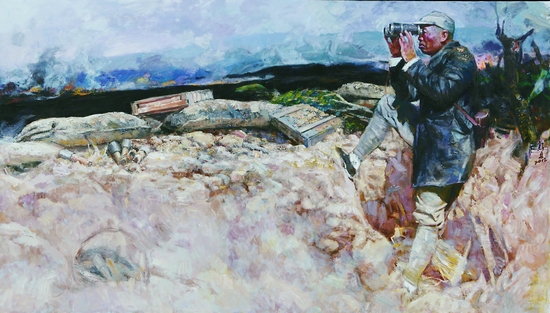 在战火纷飞的年代,许多摄影师深入到抗战一线,拍摄了许多宝贵的影像资料,给今天历史画的创作提供了丰富的史料来源。油画家曹新林的作品《百团大战中的彭德怀》就是根据已故著名战地摄影师徐肖冰在关家垴战役中拍摄的一张彭德怀的照片创作出来的。1940年,关家垴战役中,彭德怀跑到离关家垴只有500米的阵地前察看敌情,千钧一发之际,徐肖冰举起了手中的相机,这一令人难忘的历史瞬间被保留了下来。曹新林带着对彭德怀的敬仰之情,参考照片,并翻阅大量史料,观看《八路军》《亮剑》等革命历史题材电视剧,还专门走访了彭德怀的老家,参观彭德怀故居和纪念馆,开始了自己的独立创作。昔日的黑白照片已经稍显模糊,他陷入沉思,怎样才能将百团大战中的彭德怀真实而又艺术地表现出来,他有了自己的想法。不能离开照片,因为照片是历史真实,但又不能完全复制照片,要用油画特有的层次感将这样一位伟人在当时处境下的形象真实生动地再现,于是曹新林笔下《百团大战中的彭德怀》就此诞生:他背靠着壕沟的土壁,右脚伸出去,蹬在壕沟前面,双手举起望远镜,仔细地观察着日军阵地,表情凝重,身体几乎完全暴露在战壕的外面。零星的手榴弹,彭德怀雄健的身影、专注的神情,表现了战争的残酷,是八路军艰苦卓绝、英勇抗敌的真实写照。曹新林非常注意色彩的搭配,整个画面充斥着蓝灰、黄白两个主体色调,黄色的土块是虚实结构的需要,整体色彩的搭配使得彭德怀脸上、手上的暖红色愈发突出,力图用简洁的画面将人物衬托出来。历史画不是摄影作品的单纯复制,不是黑白照片染上颜色,是以摄影作品为参考,融入创作者自己的独特情感和审美,使历史真实和艺术真实达到和谐的统一。