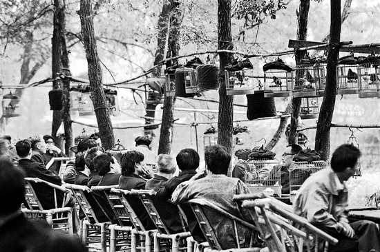 在四川,茶铺是人们生活割舍不开的重要部分,茶铺可以作为“客厅或休息室”,当然也可以派生出许许多多其它用场。比如民国时期,成都有些茶铺就成为了行帮社团或袍哥组织的聚会之所,这类茶铺又被称作“行业茶铺”。如“安乐寺茶馆是粮油业的;下东大街的闲居茶馆是纱布业的;上东大街的‘留芳’、城守东大街的‘掬春楼’、春熙南段的‘清和茶楼’是丝绸缎业的;安乐寺对面新商场茶社、春熙东段江楼茶社、大科甲巷‘观澜阁’是印刷业的;提督街‘魏家祠茶社’是皮鞋业的;商业场的‘品香’是枪支鸦片的交易市场;督院街口的茶馆是全城武师会聚之处;还有的茶馆是同乡会、同学会的会址,像中山公园(今文化宫)的茶馆内就挂着富顺县旅省同乡会、屏山县旅省同乡会等几十个会牌。”(《民国时期的老成都》王泽华、王鹤著)这一传统延续至今,当你看见茶铺门前悬挂的“XX川剧玩友协会”、“XX街道老年协会”或“XX信鸽协会”等牌子时便不会感觉奇怪了。再如成都新开街“兰园茶社”,虽不完全是从事兰草买卖的场所,因地处花鸟集市,茶社中汇聚着不少生意人,他们干脆将其作为了与买主周旋的“战场”。卖花鸟的和买花鸟的,各自泡上一碗茶,理理性性地讨价还价,做到休闲与买卖两不误。正是茶铺这种特有的人性化氛围,使生意少了一些商战中的硝烟与残酷,多了一点儿世故人情味。我还记得当时有一帮“鸟串串”(专以倒买倒卖鸟儿为业的人),为首的三十岁出头,经常穿一件己经很陈旧的黑色皮夹克,带领五六名二十岁左右的小跟班以“兰园”为据点做画眉、鹦鹉等生意。平日无事时,大家围坐在茶桌前打扑克赌一些小钱混时间,见有买主来,“皮夹克”一递眼色,跟班们便蜂拥而上,有的手上提鸟笼充作卖鸟人,有的假扮顾客在买主跟前争着与卖鸟人讲价,还有的装作互不相识的围观者在一旁哄抬行市、推波助澜,好似唱一出大戏,其目的当然是为了激将买主的兴趣而促成生意,千方百计将买主口袋里的钱鼓捣出来。