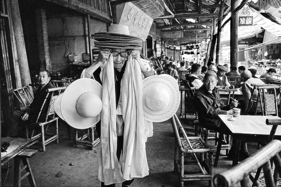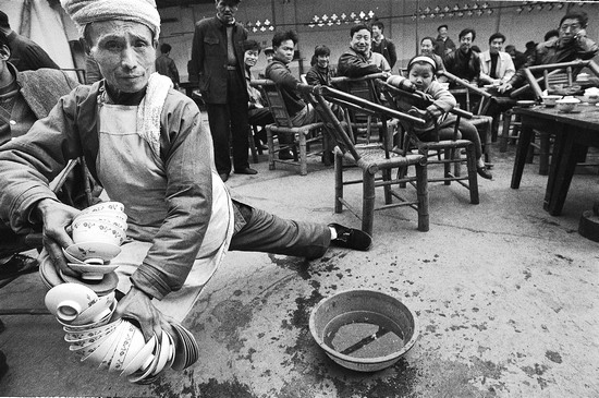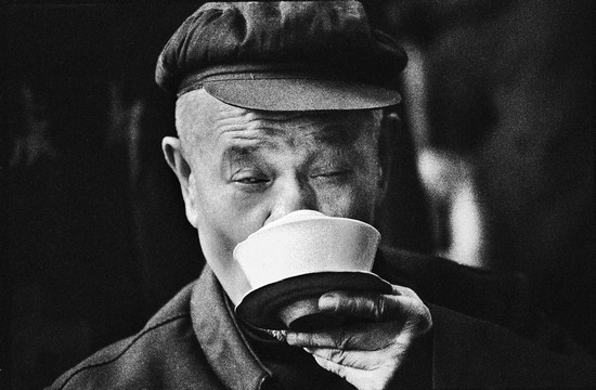 多年前回灌县(今四川省的都江堰市)老家,跟随素有坐茶铺瘾癖的幺外公喝过一次早茶。雄鸡刚一打鸣,幺外公便唤醒了酣睡中的我,来到距家仅百米开外的一座临街茶铺。天色尚黑,街灯昏黄,行人稀疏,但茶铺里却已是沸沸扬扬——喊堂的,问早的,茶船茶盖稀里哗啦的,浑然一片,仿佛全城人一天的生活从这里热热闹闹开始了。茶客之间一阵例行的寒暄之后,幺外公拣了“亘古不变”属于自己的椅子坐下来(老茶客都有了固定的座位),泡上盖碗茶,在东方既白的清晨,他那一动不动的身影就像是一尊朦胧的雕像。幺外公向来少言寡语,常常会这样静静地、心如止水般,在茶铺里坐上一整天,有时甚至连饭都忘记回家吃。此刻,从他沉迷的眼神中,我分明感觉到平日间少有显现、只有坐茶铺才流露无遗的对现实人生极大的满足。这次喝早茶的经历让我对茶铺产生了浓厚的兴趣,长时间地估摸着:是什么原因让幺外公如此迷恋茶铺?从那以后,茶馆里的那种特有的氛围也随着茶香在我心中氤氲,我也有了幺外公般的迷恋,茶馆和茶客们的百态也成了我镜头中的一个主题。