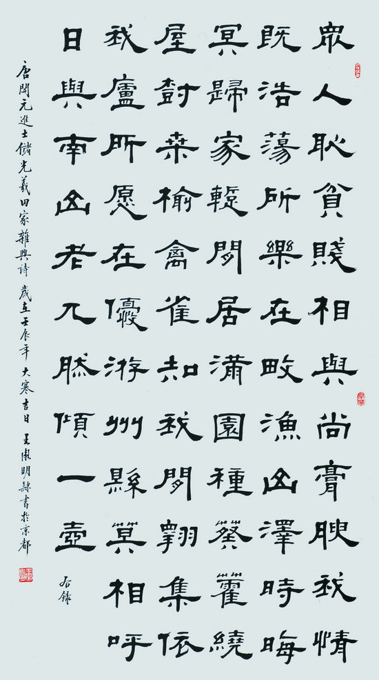 两年前做过专题书法展的王明明,在绘事之余一直没有停息对书法的研习,他深知书法于中国画创作的重要性,认为书画同源,线是画之骨,如果书法不过关,线条必然立不起来,画则瘫软无神。于是他临碑读帖,醉池数十载,其用笔劲厉、欹正互出,书风古意盈然、闲和平静,一股扑面而来的文气与静气,彰显了其儒雅、练达、通透的境界与才情,于喧然闹市中开辟了一片沉稳而又不失清灵的净土。而其弟王卫明则被目为“入手就有意思”,童年时王卫明初习楷书,不到一年,偶试隶书,14岁就形成了自己的风格,一写就是50余年,其遍临《曹全碑》《礼器碑》《史晨碑》《乙瑛碑》《张迁碑》《华山庙碑》《石门颂》《西狭颂》《痤鹤铭》以及清代伊秉绶、近人王福庵等名帖墨迹,在创作中以汉隶为基,同时加入许多清人风貌。