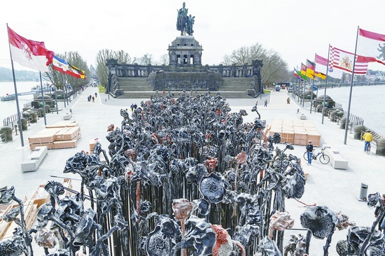 路德维希博物馆是德国最重要的当代艺术博物馆,它地处德国摩泽尔河和莱茵河的交汇处,人称“德意志角”,“角”上竖立着被德国人视为精神和旗帜的威廉一世的总高37米的雕像,还有柏林墙倒塌后运过来的墙体,这里是联合国教科文组织的世界遗产地,是德国历史文化最重要的三角地带。由800棵葵莲组成的作品《共生》矗立在德国地标上,昂首对视往来的人们;而施慧那一片叠加的《结》,无数的不锈钢管交结纠缠,风声在细管中呼啸撞击,与远处的教堂钟声互相激荡。