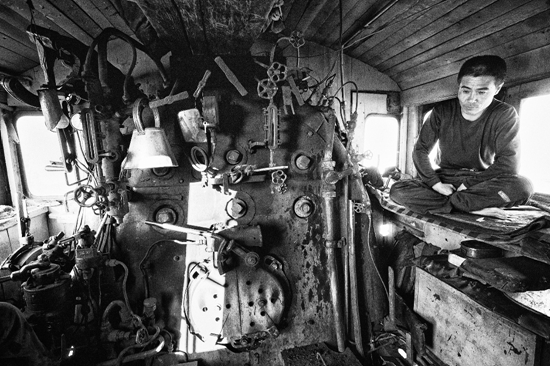 在站边找了间小旅店住了一宿,第二天我们又来到了站上,和一位大车师傅(大车是对蒸汽机车正司机特有的称呼)聊了一会儿后,大车主动邀请我们去驾驶室坐坐。上游的驾驶室约莫三平米见方,一般由三位师傅一块开动:正司机(大车)、副司机和司炉,大车告诉我们今天他们的车歇着,炉子不能灭,所以他和副司机师傅一块儿在这里看着。在狭小的驾驶室里,地面满是煤渣,大车躺在驾驶室右侧窗口的一块木板上,有一句没一句地和我们聊着天。大车最感兴趣的话题是,为什么有那么多人喜欢来拍他的铁疙瘩?我们笑了笑,说这是工业时代的遗留,拍一次少一次了,对于我们来说,这铁疙瘩是一种历史。大车若有所思,吐出一句:如果你天天和他打交道,就不会有这种想法了。大车告诉我们,平庄煤矿是1958年投产的,鼎盛时期场站内停满了蒸汽机车,把一节节运煤专用车拉出平庄。从遗留的场站规模,我们能够看出大车不是在夸大,而现在的场站铁轨已经废弃的废弃、拆卸的拆卸,来时有两位工人还在挖地下的电话线,他们说:“都卖了,这矿要废了。”