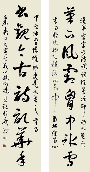 近年来,刘小毅加大探索大字创作的力度,试图拓宽自己的“圆周”。他首先注意外拓笔法的运用,对使转轻松的关注度提高了许多,对笔的调控更加自如,连执笔的位置都调高了许多,这是技法上的改进;在师法对象上自然也有了变化,他的笔下有了颜真卿、王铎、傅山等人行迹,形态更趋于开张、宽博,飞动、跳荡的笔调更加明显,黑白、虚实的对比更加强调,空间、墨色的营构更为用心。最让我惊讶的是,他的笔触有了许多的重、厚甚至拙的形态,立体的墨象在运动中产生一种雄强之势,与他本已具有的清雅之气相结合,审美的丰富性大大增加,颇为动人,这或将是他要寻觅的新的意象。