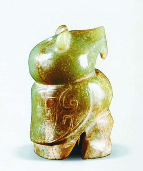 玉鸮(高5.7厘米) 河南安阳殷墟妇好墓出土 绿色有褐斑的圆雕,右侧翅上有纹饰