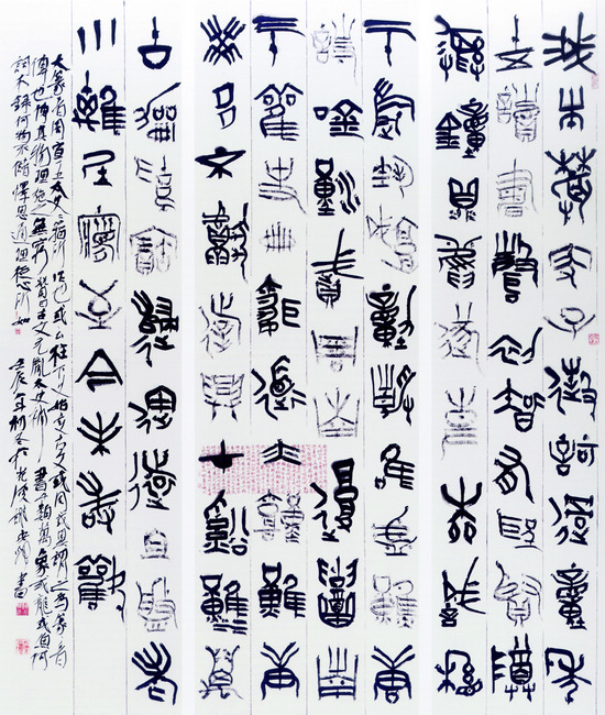“简帛书是个好东西,我也是受益者。它相对于传统的大篆、隶书等金石碑版来讲,由于墨迹多是民间写手所为,有鲜活生动、流畅自然、率意朴拙的特征,但同时存在着尖、薄、浮、糙等流弊。因此,学习简帛书要有所取舍,建议初学者还是要打下小篆、大篆的基础后再去接触它,走融会贯通之路。我是在掌握金文和简帛书差异的基础上,用金文的笔法来融会简帛书,把掌握金文的用笔作为学习简帛书的切入点,同时在文字取法上避繁就简,摒弃过于生僻结字的简帛书,形成了当下这种带有简帛书意趣的大篆书风。”高庆春介绍。