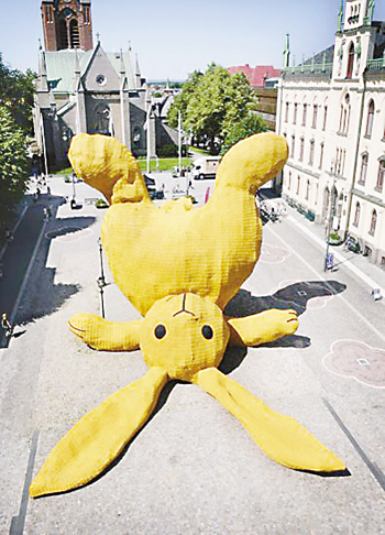 大黄鸭“攻占”维多利亚港多天之后,它突然撒气瘪下去了,万众瞩目的维多利亚港巨型橡皮鸭+3D艺术装置展以一种十分卡通的形式“中场休息”,也让公众在郁闷“鸭鸭你肿么了”之余,关注到它的爸爸——荷兰艺术家Florentijn Hofman,这个喜欢在城市中创作巨型艺术品的艺术家。他从2003年创作了10.5米高的兔子雕塑之后,每每有“巨作”惊艳城市公众的眼球。