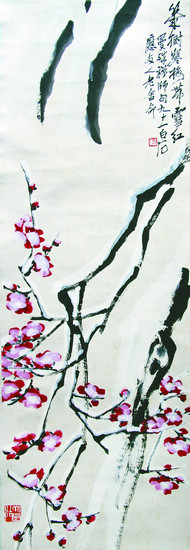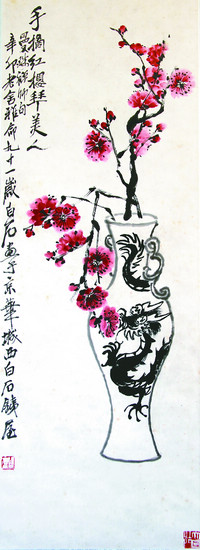 第一幅是樱花,老人画了一支带双耳的大花瓶,白磁,用枯墨在瓶上画了一条蛟龙,有两枝红樱花插在瓶中,一枝直立,一枝下弯,作拜美人状。