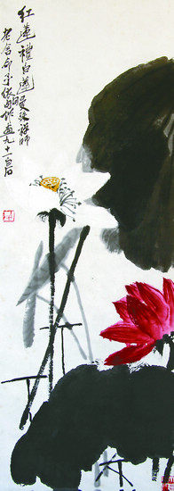 第二幅是一朵红莲和一朵白莲,低处的红莲向上方的白莲作点头行礼状,旁边是大片的墨荷叶。