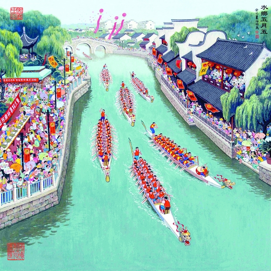 画家廖开明曾四次去到嘉兴,参与节庆活动,深切感悟体会人民参与节日的欢乐。他以人民群众喜闻乐见的年画形式,创作了《水乡五月五》,描绘出了秀丽的江南水乡端午节时赛龙舟、裹粽子、制作香包等民俗活动的欢腾情景,展现出了端午节这个人民节日的盛大和壮观。
