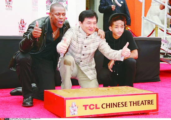 6月5日,中国香港影星成龙留手脚印仪式在美国加州好莱坞的中国剧院举行。图为(左到右)影星克里斯·塔克、成龙和童星杰登·史密斯在仪式上合影。