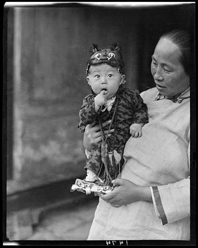 民国时期的人物肖像,戴虎头帽的小孩。
