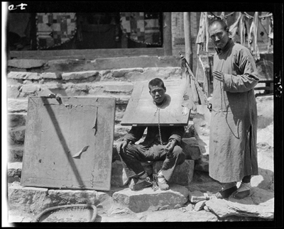 自戴刑具还愿者(旧时穷人祈愿成功后,用这种方式向佛祖还愿)。