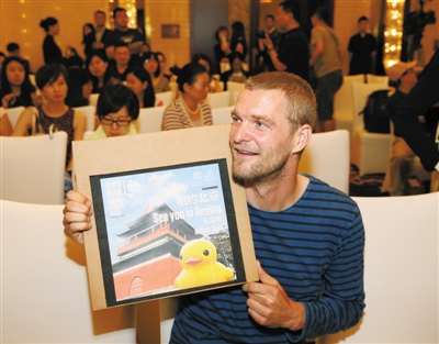 荷兰艺术家霍夫曼前日在京宣布将为北京定制一只高约10米的大黄鸭。新京报记者 王远征 摄