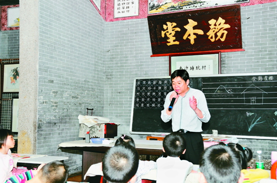 中国书协分党组成员、副秘书长潘文海在塘坑村为孩子们讲授书法课