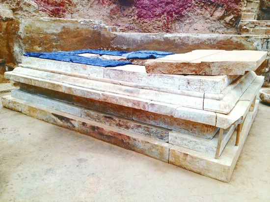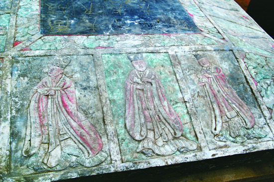 在主室的北部中央放置有石棺床,棺床上原放置有石椁木棺,现已被毁,仅余部分石构件。目前发现有石椁南侧底板1块、南侧立板1块及顶盖1块,尤以石椁南侧立板的造型最为精美,中部雕刻有“仿木构假门”,浮雕出门框、门簪、门扇及乳钉、门锁等形象,并施以彩绘,尤其浮雕门锁上贴金装饰手法,令人叹为观止。