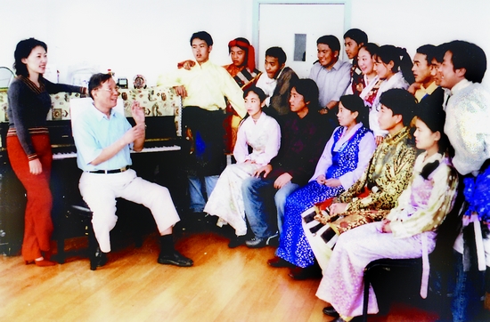 刚开始,藏族孩子们不会保护自己的嗓音,兴致高的时候便聚在操场上从早唱到晚,老师教的方法全忘了,嗓子也冒了烟,更把按时练琴、练唱的任务忘到了脑后。系里的年轻教师就相互探讨,干脆根据学生的背唱记谱,再以现记的歌谱为蓝本生动地教学,让那些只知张口便唱、有着金属般嗓音的孩子,学会用科学方法驾驭声音。不到一年,孩子们已经养成下午4点多就到琴房打卡“抢”座练唱的习惯,已经有人能像样地弹钢琴了。