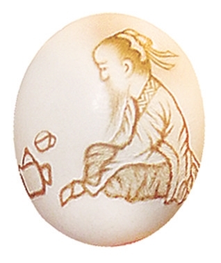 武侠中的江湖高手往往大隐隐于市,其武功出悟于寻常生活。蛋雕江湖亦是如此。好的蛋雕作品不仅仅在于精致,更因其取材于生活,能够表现丰富的生活内涵。张宇的蛋雕作品恰是遵循了这一江湖道理。他遍翻图书,寻找有特点的形象,革命人物、西游人物栩栩如生;关注社会时事,福娃蛋雕等与时俱进;胡同里散步之余留心观察,撂鼻涕、剔牙、打哈欠等老北京人典型形象就变成绝佳的素材;甚至是一句诗也经过加工创作跃然于蛋壳上:“闭门静坐自己过,闲来莫论他人非”,张宇绘一老翁静坐,面前摆一茶壶茶杯,画面简洁意蕴深长。好学笃行,即是成就蛋雕武功的精髓所在。