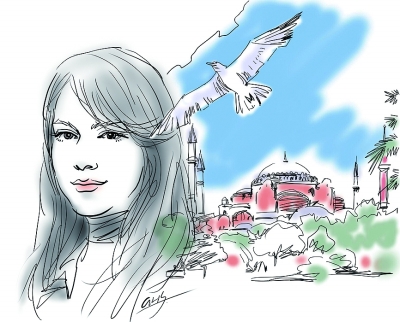 几年前,我有幸参加了在土耳其首都安卡拉举办的第四届安卡拉国际艺术论坛,有机会感受这个国家的蓬勃活力与历史的文明印记。论坛上来自中国的艺术作品吸引了众多土耳其参观者。记得一位土耳其女青年对我的一幅画作《紫禁城的桥》很是欣赏,连续两天都出现在这幅画前。《紫禁城的桥》画面描绘的是一位身着现代民族服饰、身形窈窕的女子背影,自信地漫步于紫禁城桥畔,画面色彩由蓝、红、草绿、金等色块构成,古代传统的装饰纹样点缀其中,使画面呈现一种东方的华丽之美。这位土耳其女青年说,从这幅画作中深切感受到了当今中国社会的风貌,也领略到中国悠久的历史和灿烂的文化,对中国艺术家的表现技法与艺术语言同样感到惊奇与欣赏,非常希望能有机会到中国旅行,到中国的艺术家中去交流现代艺术。我为这位艺术女青年充满活力的谈吐所感动,现场为她作了速写肖像画,当她接过画时竟然兴奋地欢跳起来。周围更多的参观者围拢过来,都希望得到一幅中国人为自己所作的速写肖像。