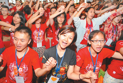 7月14日,参加支教的大学生在启动仪式上齐声同唱主题曲“仲夏的希望”。当日,来自两岸四地24所高校的近300名大学生从台湾师范大学出发,奔赴大陆、台湾24所偏僻乡村或部落学校,为当地学生进行课业辅导。