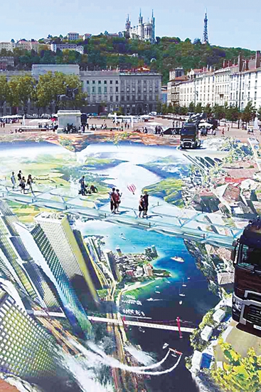 这幅巨大的画作犹如一座地下城市,画家通过色彩丰富的层次运用达到三维立体效果,给人一种步入超现实世界的错觉。活动期间,这件3D画作平铺在地面上,人们可以随意走上去,体验身临其境的奇妙感觉。远方的风景和城市的摩天大楼都如此逼真,在画中的高架桥上走动,“居高临下”的滋味甚至会令人忘记自己其实身在画中。许多当地居民前去观看,除了感受神奇的艺术作品外,还可以坐上雷诺卡车的新车型进行一番体验,可谓一举两得。