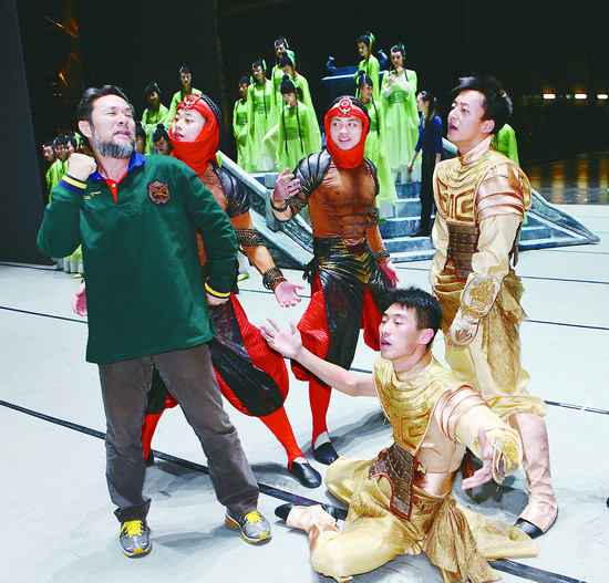 陈维亚(左一)在辅导舞剧《马可·波罗》演员表演