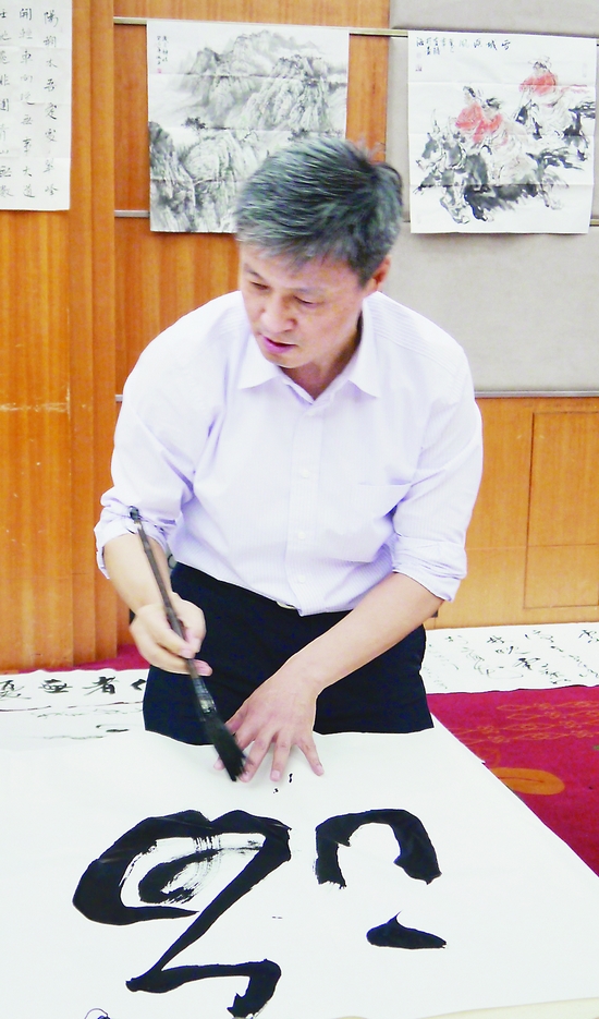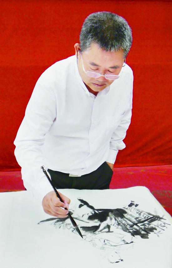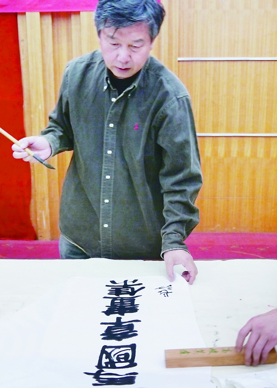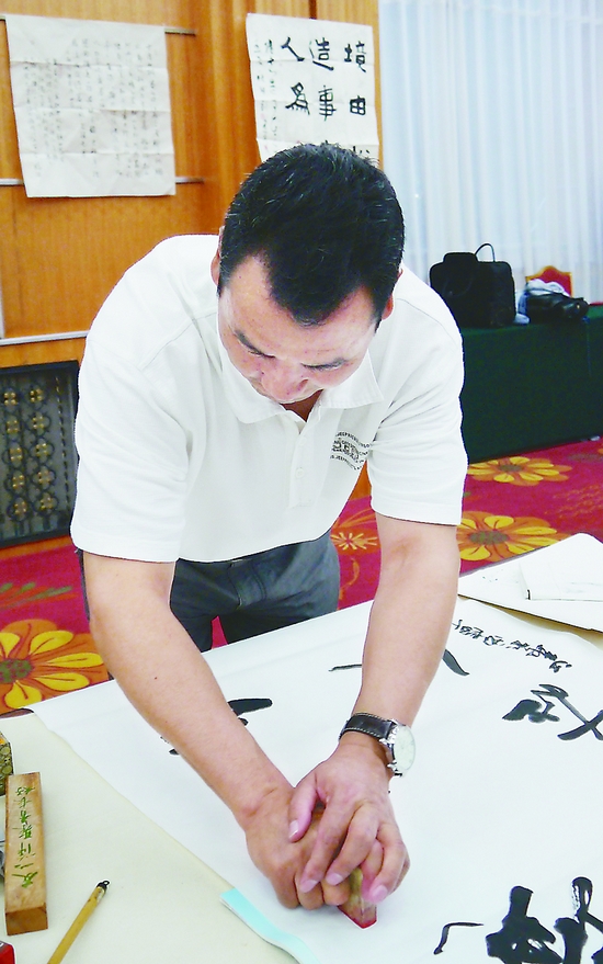 参与慰问活动的美术、书法家们为灾区创作并捐赠作品,还为当地文艺家进行辅导。图为著名书画家吴长江、陈洪武、陈钰铭、郭正英在慰问笔会上创作。