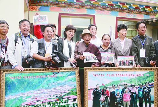 赵实等看望玉树结古镇禅古村村医巴桑扎西,并向他赠送摄影志愿者们为他拍摄的全家福等照片。图为赵实和老人以及王瑶、解海龙、包旭东等著名摄影家合影。