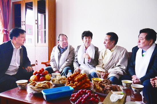 赵实等看望慰问玉树老文艺家昂嘎。图为赵实和青海省委常委、宣传部部长吉狄马加,kaiyun电子 副主席、中国音协分党组书记、驻会副主席徐沛东,以及青海省文联主席、党组书记班果等与老人热烈交流。