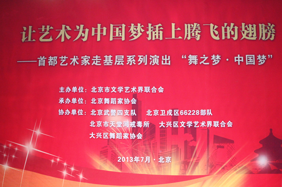 在迎接八一建军节前夕,由北京市文联主办,北京舞协承办,大兴区文联、大兴区舞蹈家协会、北京武警四支队、北京卫戍区66228部队、北京市天堂河戒毒所协办的“让艺术为中国梦插上腾飞的翅膀——首都艺术家走基层系列演出“舞之梦·中国梦”专场演出,于7月26日下午在大兴举行,北京市文联党组副书记张光一等有关领导出席了演出活动。