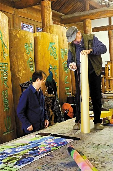 征得黄老同意,我们把这些画拍下来,见高度不够,老人家搬来了一个木梯,当我们在木梯上颤悠悠举起相机时,他扶着我们的脚,不停地提醒:“当心,当心。”接着,黄老又搬出一幅巨作,铺在画桌上。我问黄老,是在这桌上画的吗?他摇摇头,用手指了指边上的升降机,原来是把纸贴在墙上,老人家站在升降机上画的。欣赏完巨作,我们想把它卷起来,可是卷了几次都不齐,一瞬眼,只见黄老已站在画桌上了,把画扶正笃齐,我们齐叹老人家的身手敏捷。