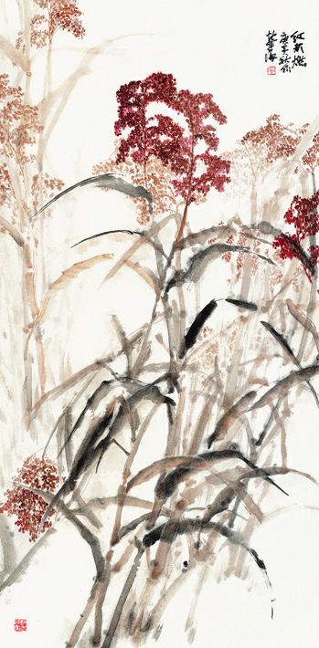 李荣海的国画创作根植于他的全面修养和书法功力,他从农村走来,对农村生活的情结,对农家深厚的情感,点燃了他不熄的艺术火花。他的花鸟画多以农村所见为题材,高粱、玉米、大白菜均入笔端,他的笔名“耕夫”,印鉴“家在鲁西黄河古道”、“耕夫草堂”,无不带着深厚的农家情感,“耕”是他作品中出现最多的一个字,勤奋耕耘是他成功的根本所在。他的作品贯穿了一条完全传统的中国文人画的轨迹,所选题材大致都在传统文人画范畴,但时时有自己生存环境中的所见所闻。书法中的布局开合直接影响了他的绘画,书法中的用笔更是直接用于造型手段,“直从书法演画法”,在他的画中同样体现出他的书法底蕴,若除去表面的浓淡干湿,笔墨核心是中锋用笔,体现出凝重厚实的品质,进而引申入墨。而在书画背后可以清晰地看到的是他的做人、工作、性格、品德的巨大作用,这是传统文人画的精粹所在,也是中华民族精神“自强不息、厚德载物”和“写意”的艺术精神之所在。他走过的艺术道路给了我们新的启示,中国传统的文人画会在未来焕发青春,文人画道路不但能行得通,而且必将影响更多的后来人。