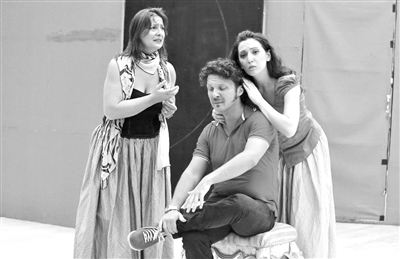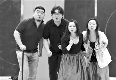 沈洋(左二)和黄英(左三)在剧中分饰费加罗和苏珊娜这对情侣。 新京报记者 郭延冰 摄