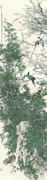 《早春三月》是姚大伍于壬辰年(2012)元月着手创作的,此作纵355厘米,横94厘米,这件作品由艺术家耗时4个多月才得以完成。画面描绘了江南早春的美景,有机地将喜鹊、丛竹、鸳鸯、太湖石绘制其中,内容丰富充实,构图疏密有致,极富层次感。画中丛竹茂密繁盛,梅花俏立枝头,或含苞初展,或盛开怒放;喜鹊栖于梅梢,三两成群,生机盎然;一对鸳鸯,一静立蹲踞,一蜷首歇息,活灵活现。鸳鸯的静,喜鹊的动,二者形成鲜明的对比,更显示出江南早春寓动于静、自然闲适的意境。画家对生活观察细致,艺术概括精炼,构图设计别具匠心,达到了“花能解语鸟能言”的境界。