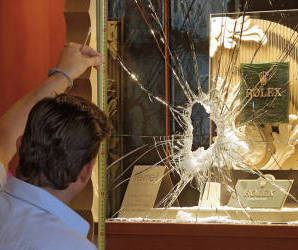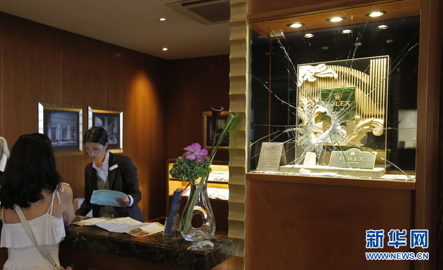 当地时间8月16日,法国南部尼斯佩特雷宫殿展览过程中一处防盗玻璃被窃贼敲碎,数块名贵品牌手表如劳力士等被盗。而就在不久前,法国尼斯附近的戛纳一次展出中,价值4000万欧元的珠宝与名表被窃贼洗劫。图片来源:东方ic