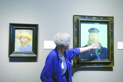 底特律艺术学院讲解员在讲解梵高《邮递员鲁伦》的细节