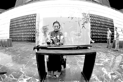 除了剧场里的演出外,王潮歌还在剧院廊道、前厅、电梯旁、咖啡厅等处营造出民乐的氛围(上图)。演奏家们身着华服演奏乐器,一旁的指示牌介绍了每个人姓名和他们弹奏的乐器。观众有的驻足聆听,有的拍照留念。