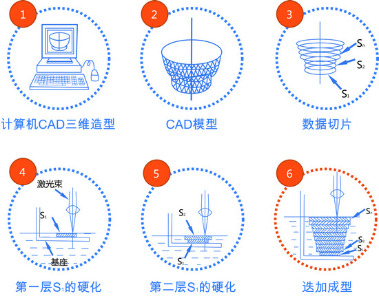 应用计算机软件设计出三维数据,或者直接用三维数据采集设备获得数据,然后把数据导入特定的快速成型设备(俗称“3D打印机”),用液体树脂、粉末、丝状工程塑料等材料,通过添加式构法,逐层“打印”出产品。