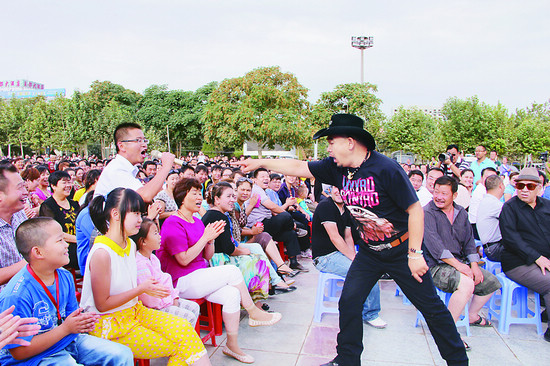 高耸着毛主席与库尔班大叔握手雕像的新疆和田市团结广场上,欢声笑语、人潮涌动,高温并没有影响到人们欣赏节目的兴致,3000余名当地观众开怀地乐着、用力地鼓着掌,以此表达对节目的喜爱和演员的感谢;