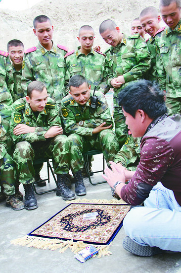 魔术师李学义在盖孜边检站近距离给官兵们变魔术